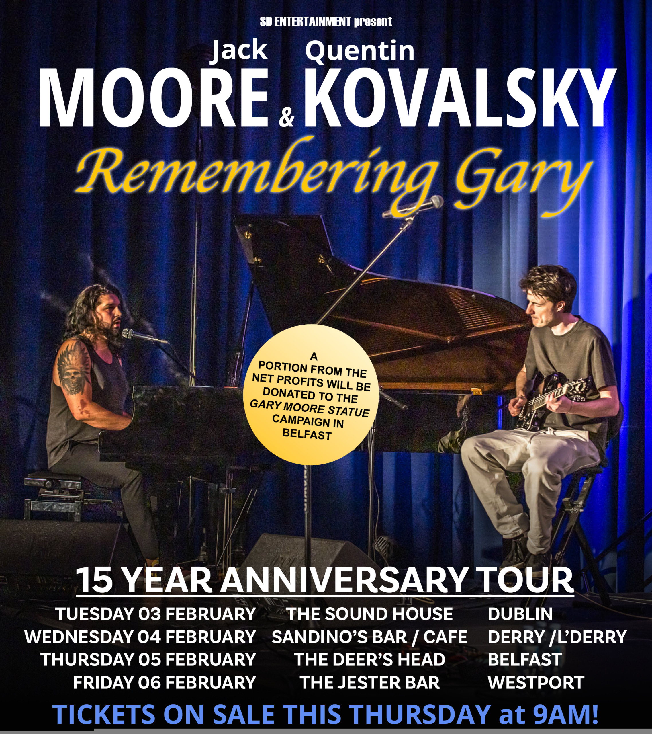 Moore and Kovalsky appear in The Jester Bar in Westport on February 6th, Gary Moore’s 15th anniversary. The tour begins in The Sound House in Dublin on February 3rd and moves to Sandino’s Bar and Cafe in Derry City on February 4th, before arriving in Gary Moore’s hometown of Belfast on February 5th at The Deer’s Head.